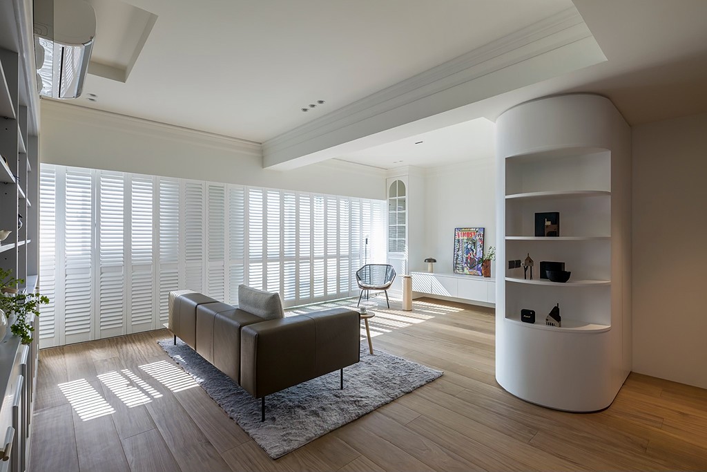 圆弧柱体带有开放格的设计,提供收纳,同时在公共空间成为自然的区域划分与视觉焦点。