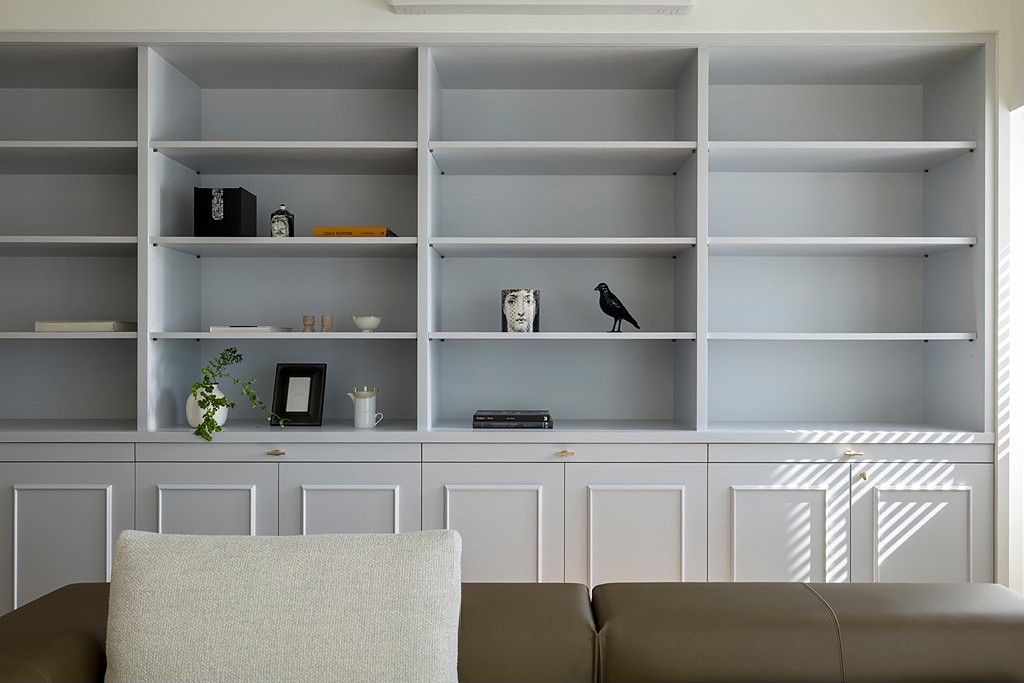 通过天花板设计的高低差,拉升行走视线,增设功能性开放柜,形成有序却不生硬的设计脉络。